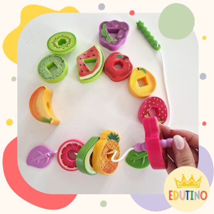 Farebná motorická hračka s húsenicou, ktorá učí deti navliekať ovocie, rozpoznávať tvary a rozvíjať jemnú motoriku.