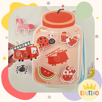 Zábavná edukačná knižka na suchý zips s 11 stranami plnými jednoduchých logických úloh pre deti od 2 rokov – priraďovanie zvieratiek, ovocia, dopravných prostriedkov a ďalšie.