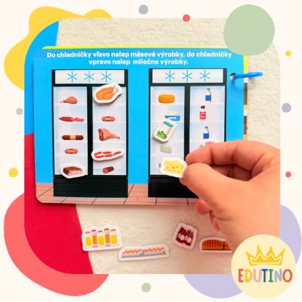 Interaktívny pracovný zošit so suchým zipsom, ktorý učí deti správnemu nákupnému správaniu a hravo rozvíja logiku a jemnú motoriku.