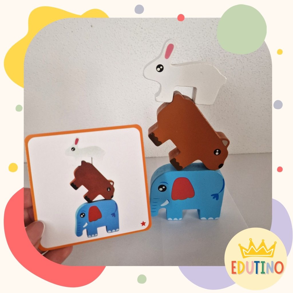 Balancujúce zvieratká sú drevená montessori hra, ktorá deti motivuje ukladať roztomilé zvieratká na seba podľa predlohových kartičiek – tak, aby veža nespadla.