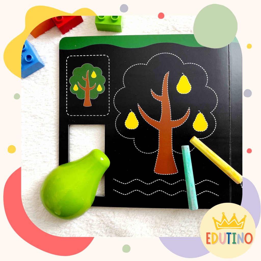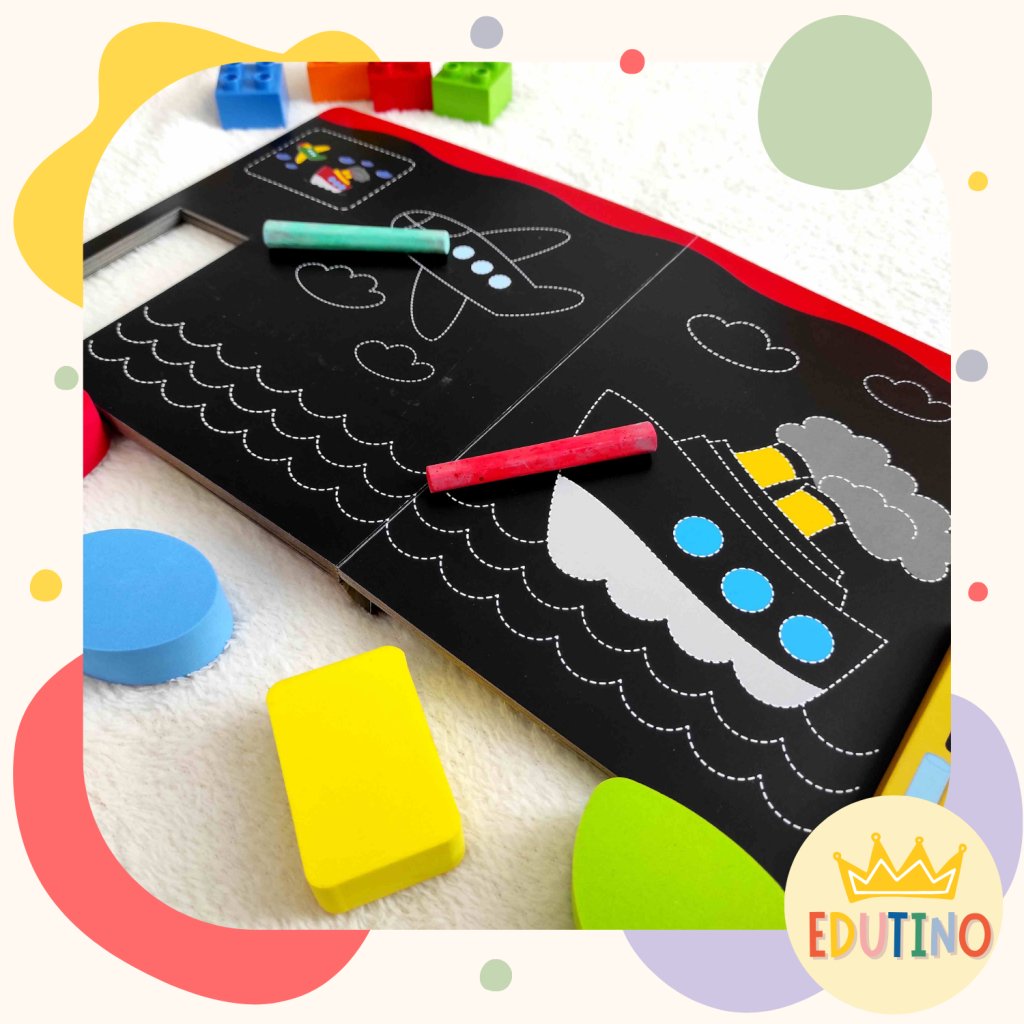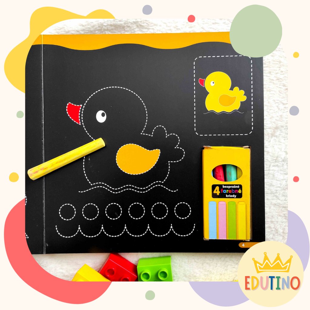 Interaktívny zošit s tabuľovým podkladom a bezprašnými farebnými kriedami rozvíja kreativitu, vnímanie tvarov a farieb aj jemnú motoriku.