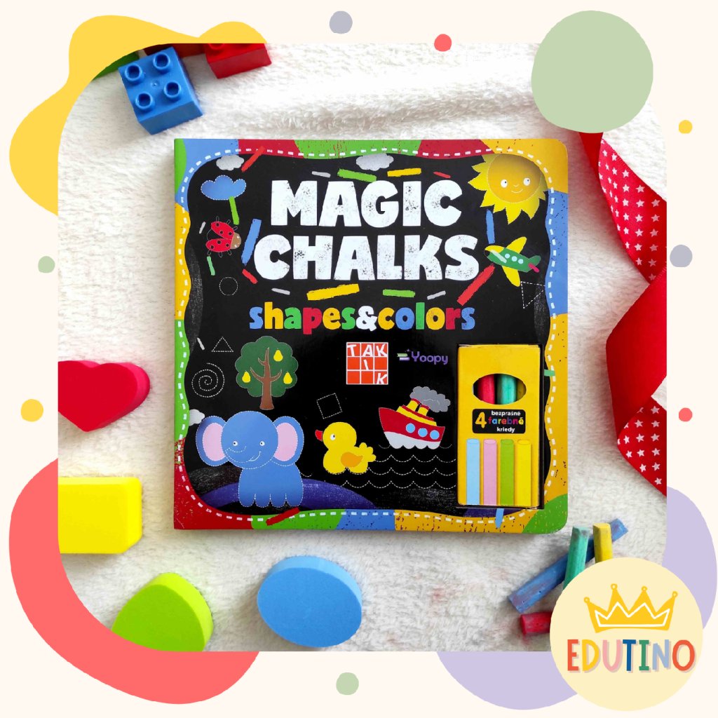 Zošit Čarovné kriedy – Tvary a farby prináša jedinečný zážitok z kreslenia: všetky obrázky a jednoduché úlohy sú vytlačené na tabuľovom podklade, takže deti môžu kresliť a vyfarbovať znova a znova pomocou priložených 4 bezprašných farebných kried.