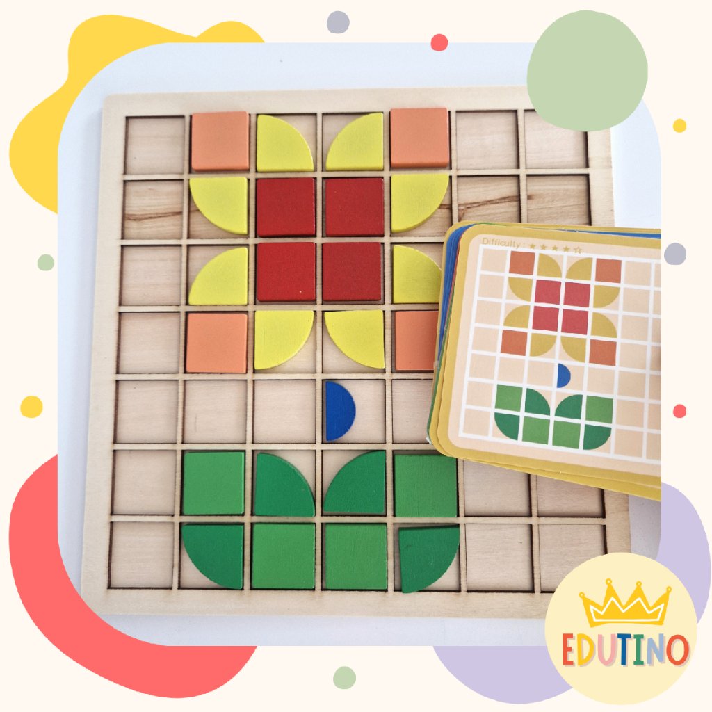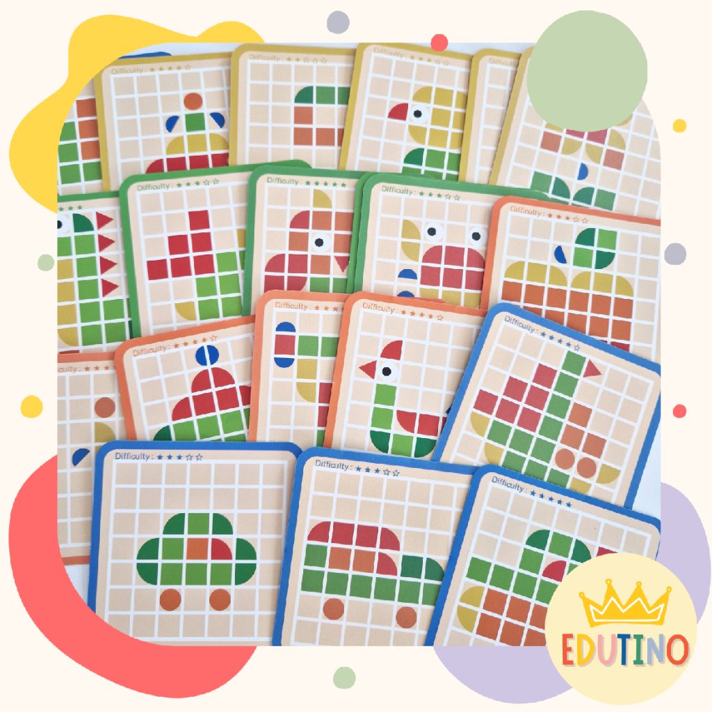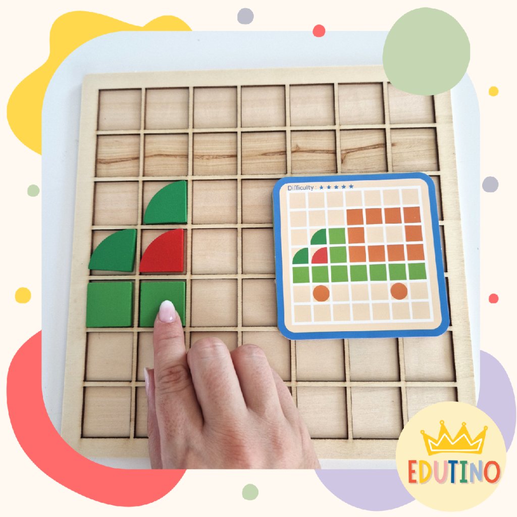 Táto interaktívna mozaiková skladačka je ideálna pre deti od 3 rokov. Pomocou farebných drevených tvarov a 20 obojstranných kartičiek si môžu deti vyskladať obrázky zvieratiek, čísel či rôznych postavičiek priamo do mriežky.