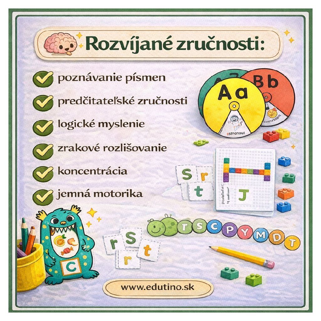 Zábavný digitálny súbor plný aktivít, ktoré pomáhajú deťom hravou formou spoznávať písmená, rozvíjať myslenie a precvičovať jemnú motoriku.