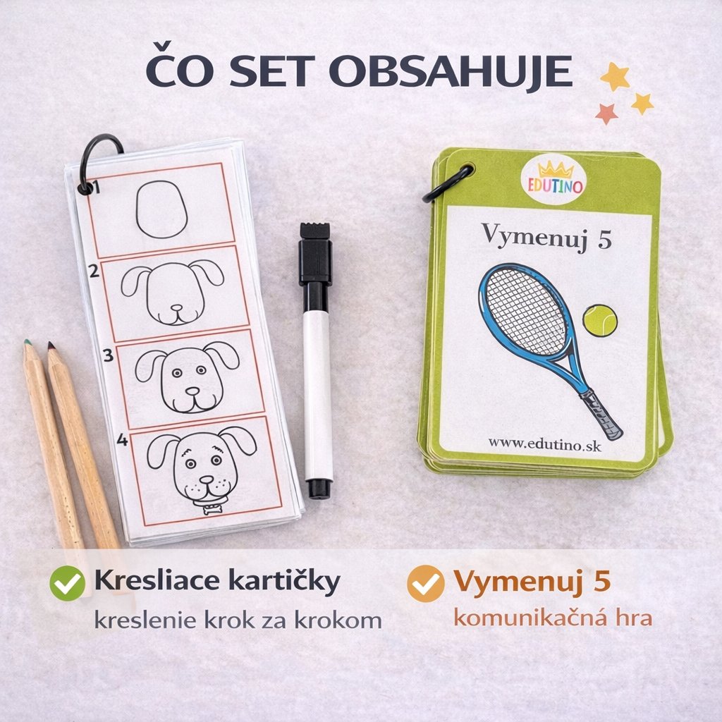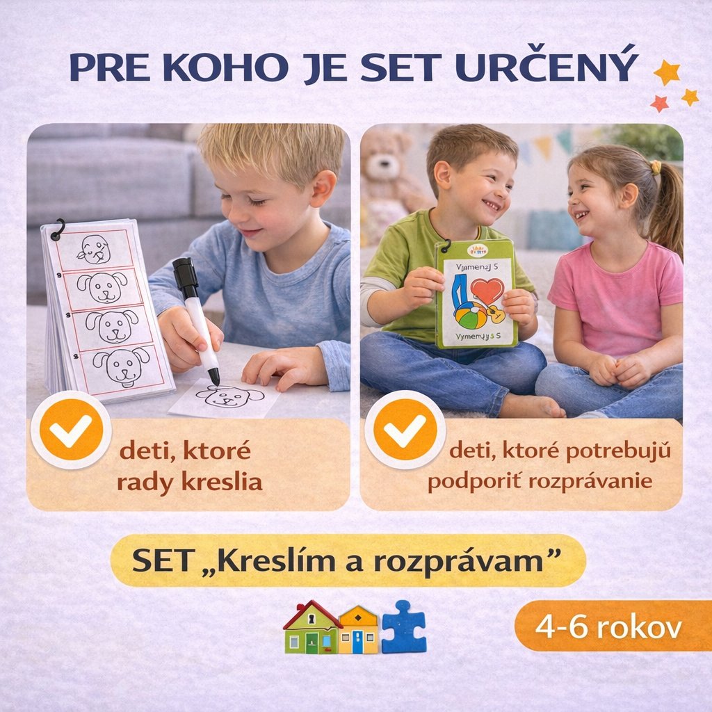 Set „Kreslím a rozprávam“ je premyslená edukačná pomôcka, ktorá podporuje rozvoj komunikačných schopností, slovnej zásoby, logického myslenia a kreativity detí. Spája dve obľúbené aktivity – rozprávanie a kreslenie – do jedného hravého celku.