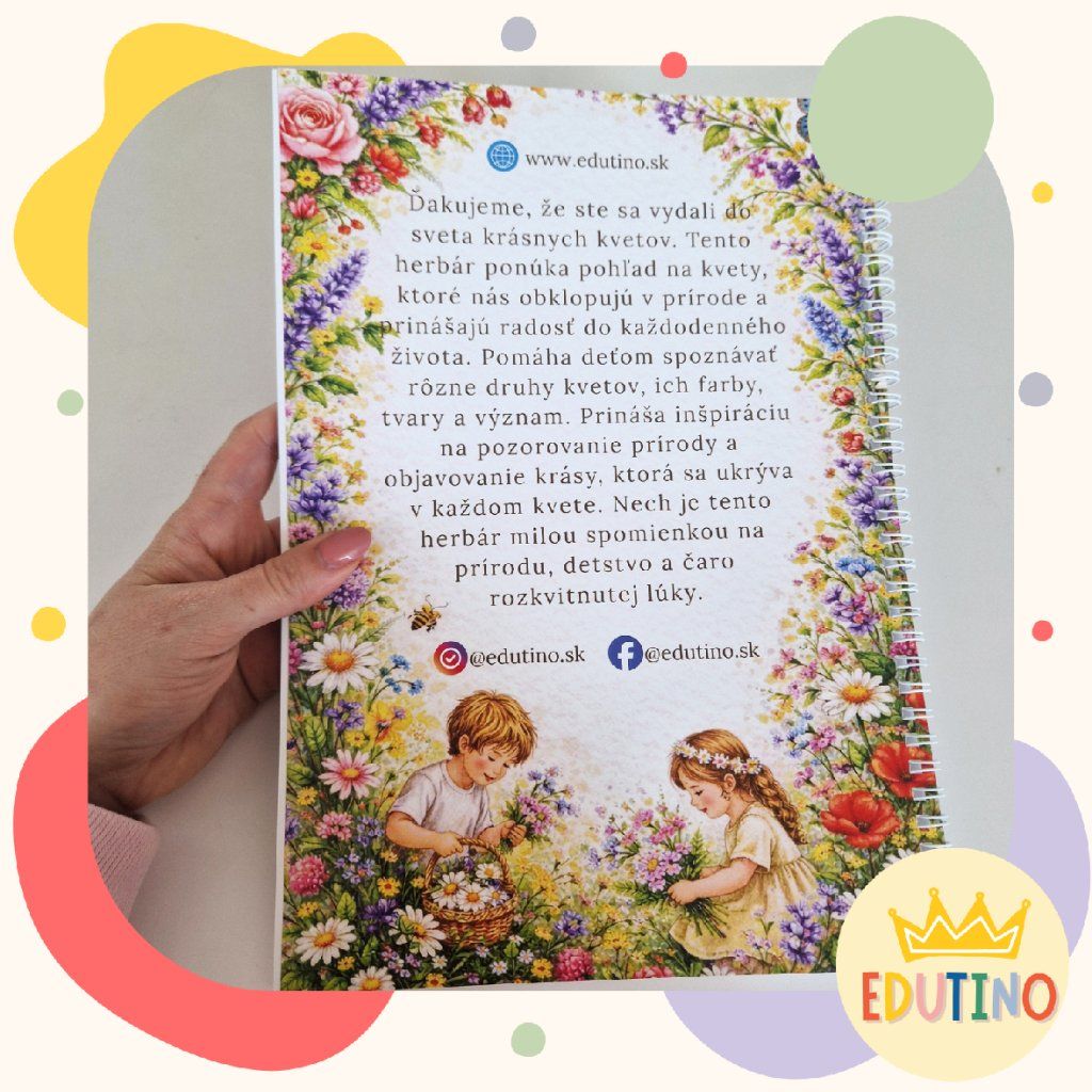 Kvetinový herbár je edukačná pomôcka, ktorá hravou a prirodzenou formou približuje deťom svet prírody. Obsahuje 20 typických slovenských lúčnych kvetov, ktoré deti môžu spoznávať, pomenovávať a postupne si ich zapamätať.