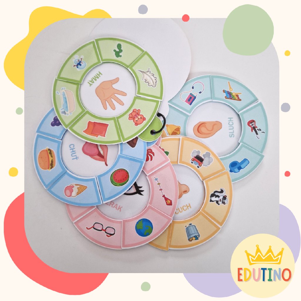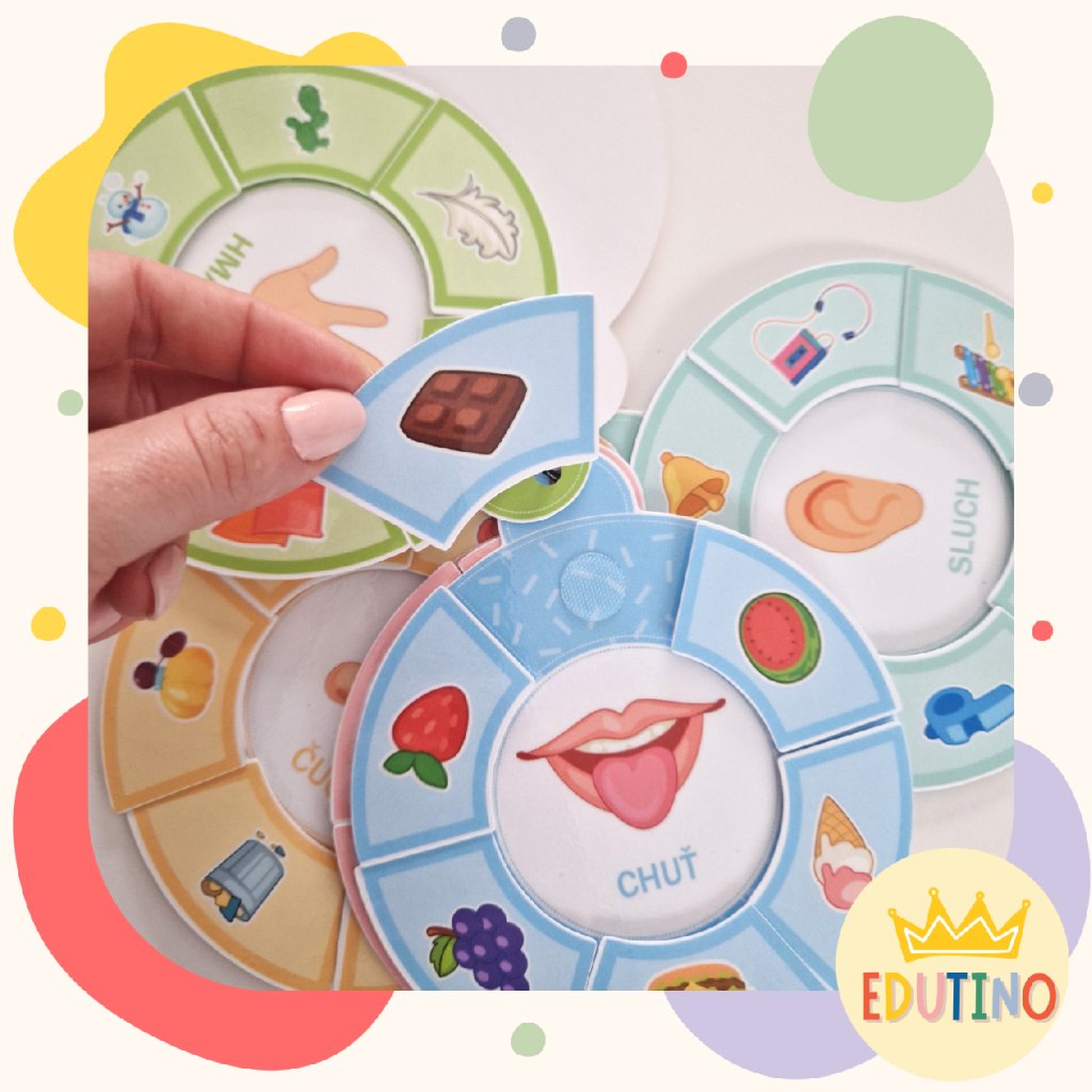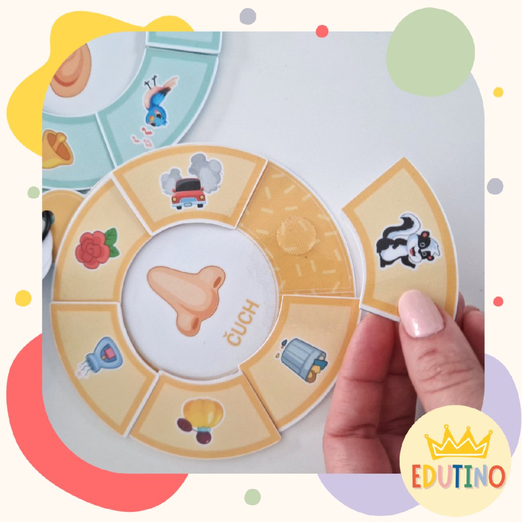 Každý zmysel je spracovaný formou prehľadného kruhu, do ktorého dieťa priraďuje obrázky podľa toho, čím danú vec vnímame – čo vidíme, počujeme, ochutnávame, cítime alebo sa toho dotýkame. Vďaka suchému zipsu si dieťa môže úlohy opakovane skúšať a opravovať bez frustrácie.