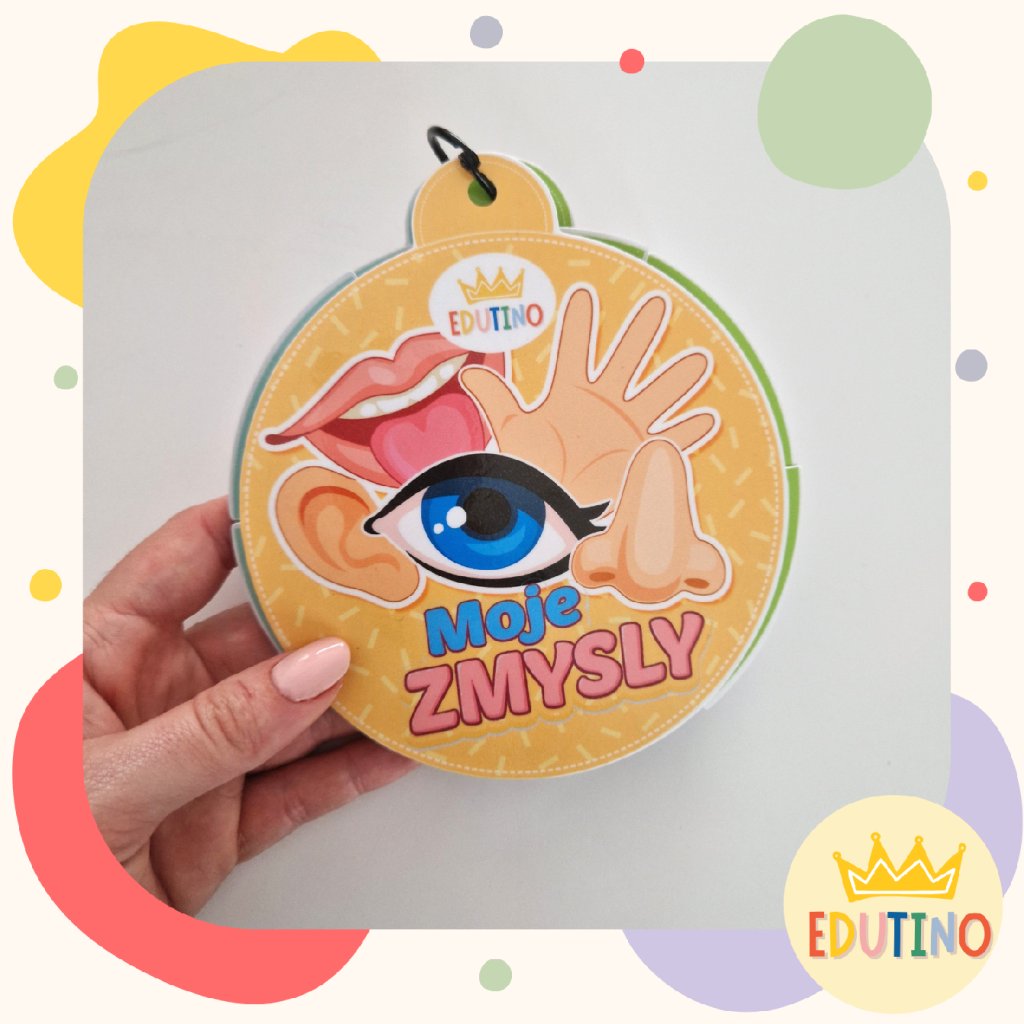 Moje zmysly je edukačná knižka na suchý zips, ktorá deťom pomáha pochopiť svet okolo seba pomocou piatich základných zmyslov – zrak, sluch, chuť, čuch a hmat.