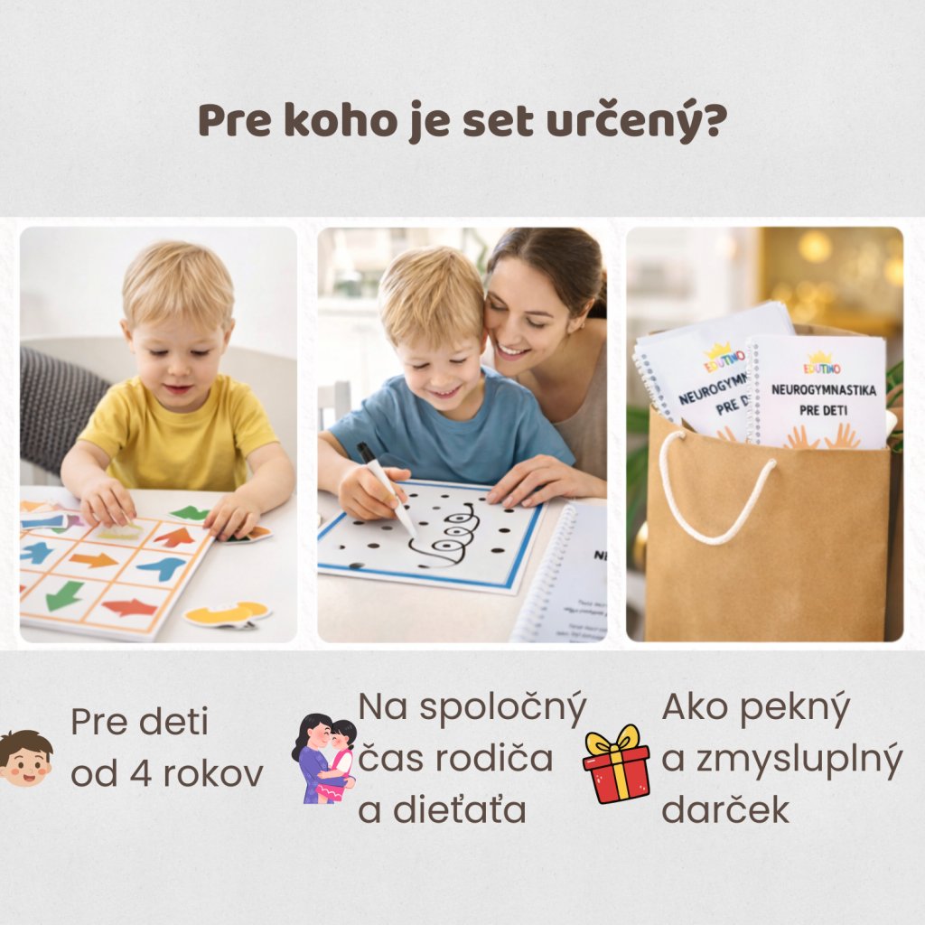 Všetky aktivity sú prehľadne spracované, hravé a vhodné na opakované používanie, či už doma, v škôlke, v poradniach alebo pri práci so špeciálnymi pedagógmi. Set je ideálny pre rodičov, ktorí hľadajú zmysluplnú alternatívu k obrazovkám a chcú podporiť zdravý vývin dieťaťa hravou formou.