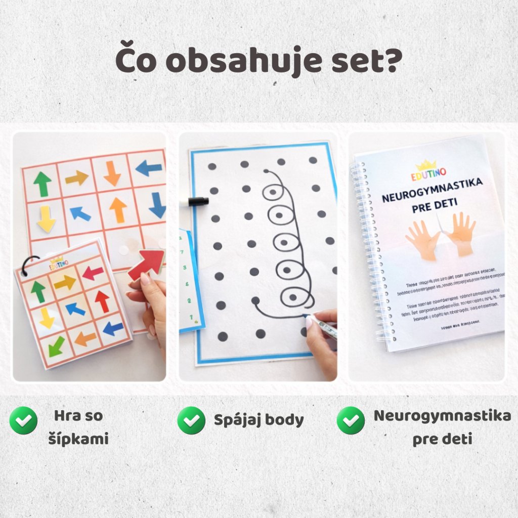 Set obsahuje neurogymnastické aktivity, pohybové úlohy a grafomotorické cvičenia, ktoré: