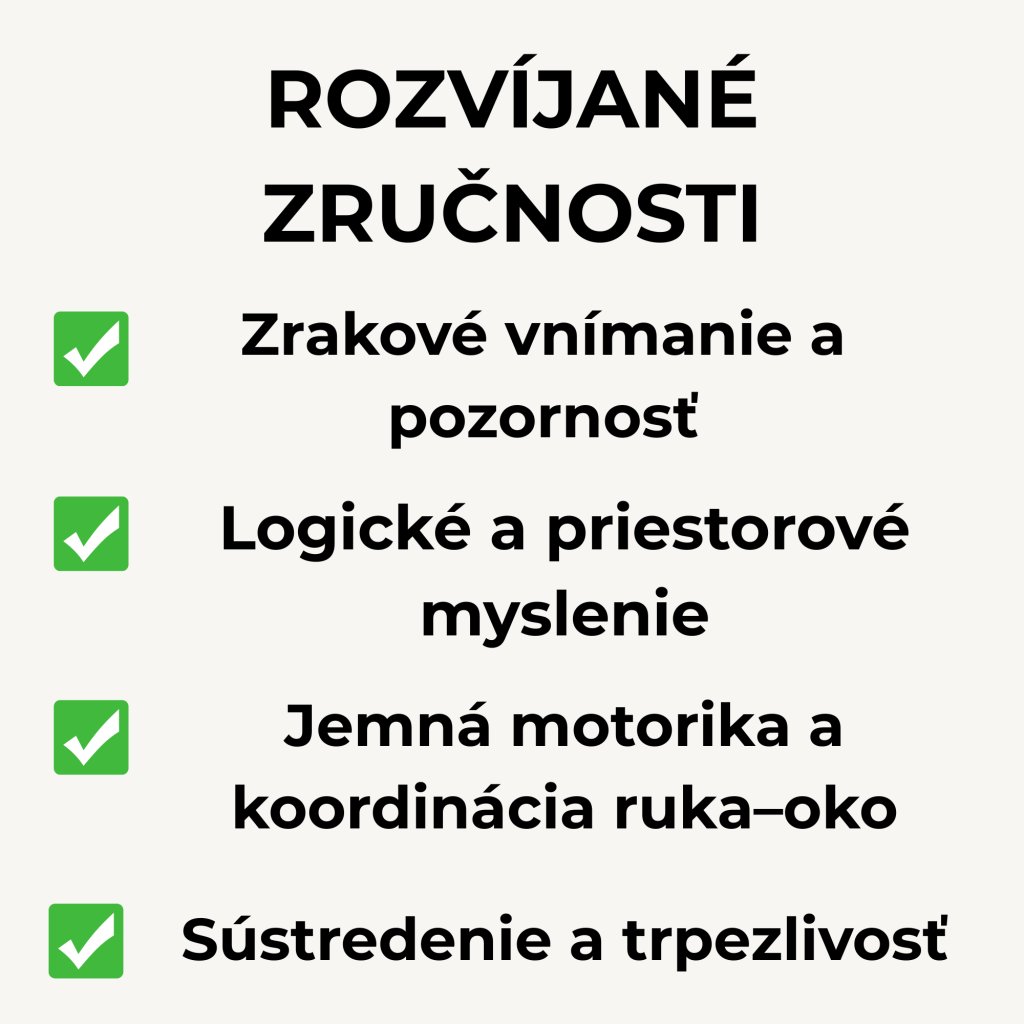 Interaktívna aktivita, v ktorej deti spájajú farebné body podľa predlohy, rozvíja logické myslenie, pozornosť, koordináciu ruka-oko a priestorovú orientáciu. Pomocou stierateľnej fixky si precvičia jemnú motoriku – ak sa pomýlia, jednoducho zmažú a skúšajú znova.