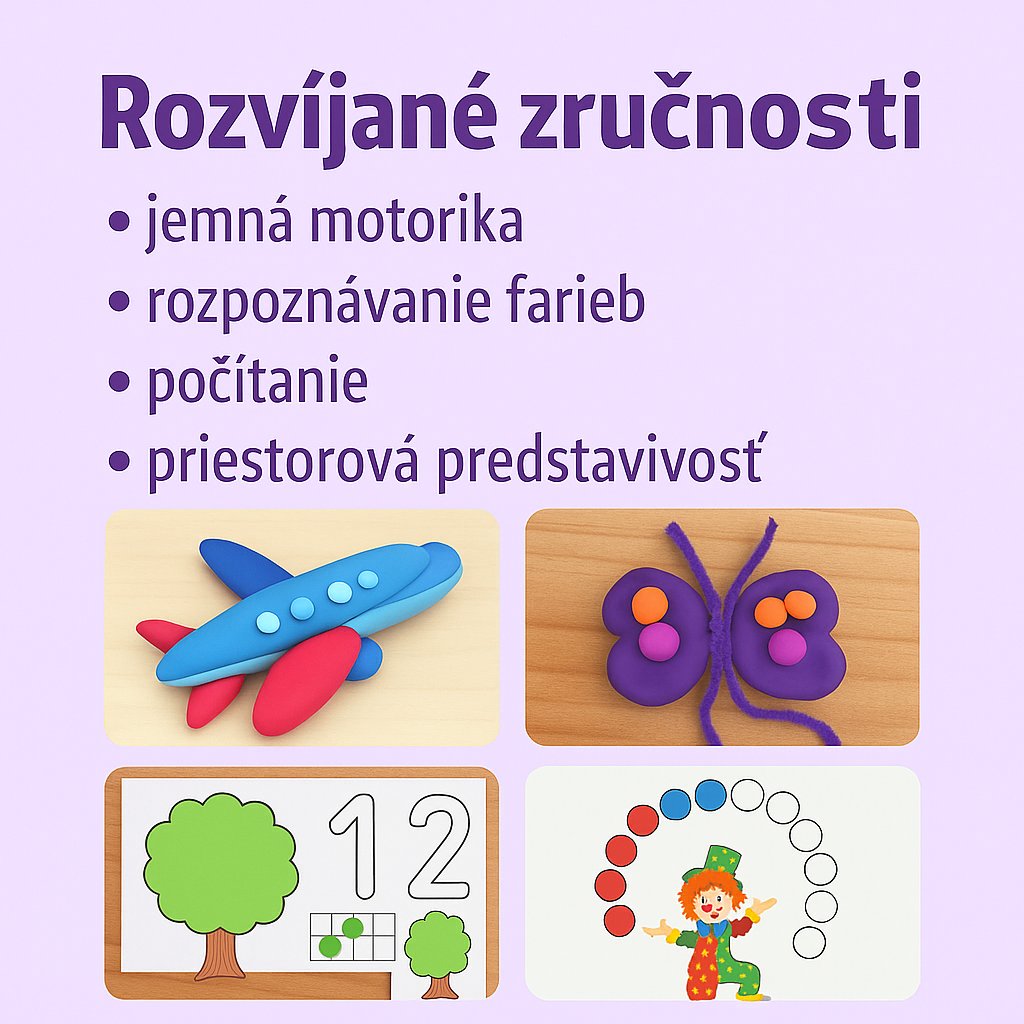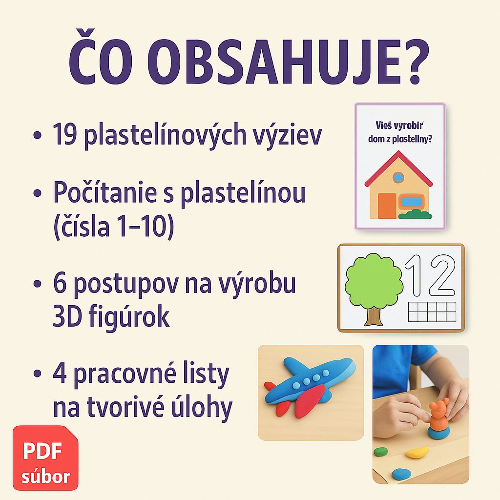 Zábavné aktivity s plastelínou, ktoré rozvíjajú jemnú motoriku, kreativitu a predstavivosť. Súbor obsahuje 19 úloh plastelínovej výzvy, počítanie od 1 do 10, 6 návodov na 3D figúrky a 4 pracovné listy na tvorenie.