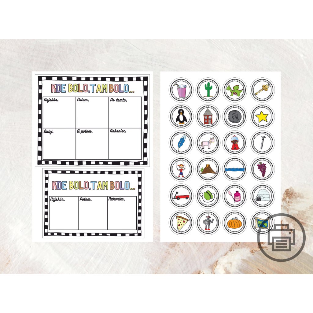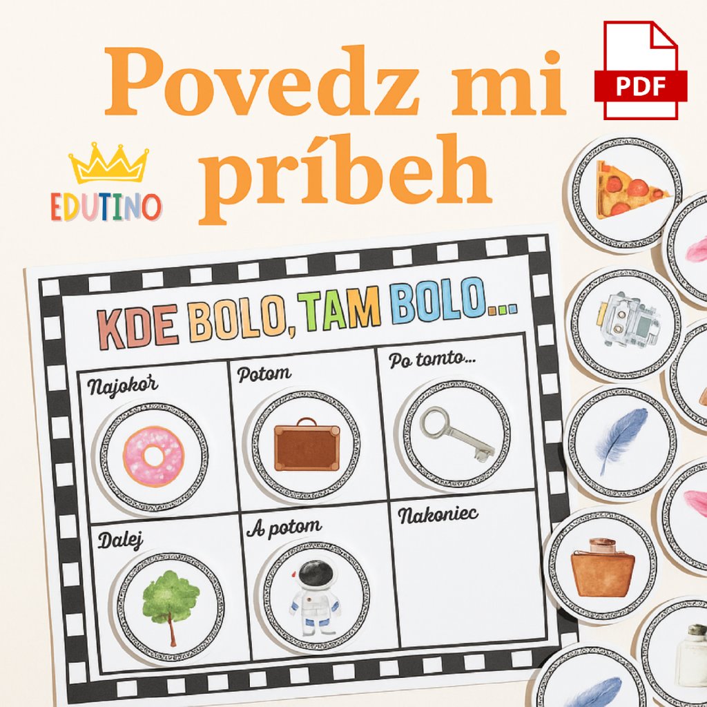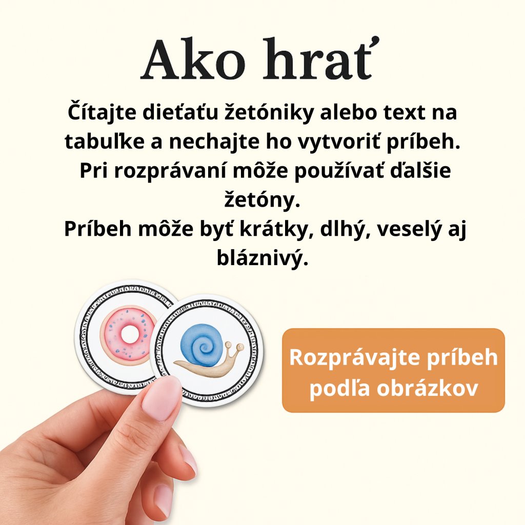 Digitálny súbor obsahuje 2 tabuľky a 48 obrázkových žetónov. Je ideálny na rozprávky pred spaním, vzdelávacie chvíľky, dlhé cesty autom, čakanie alebo rodinné hry.