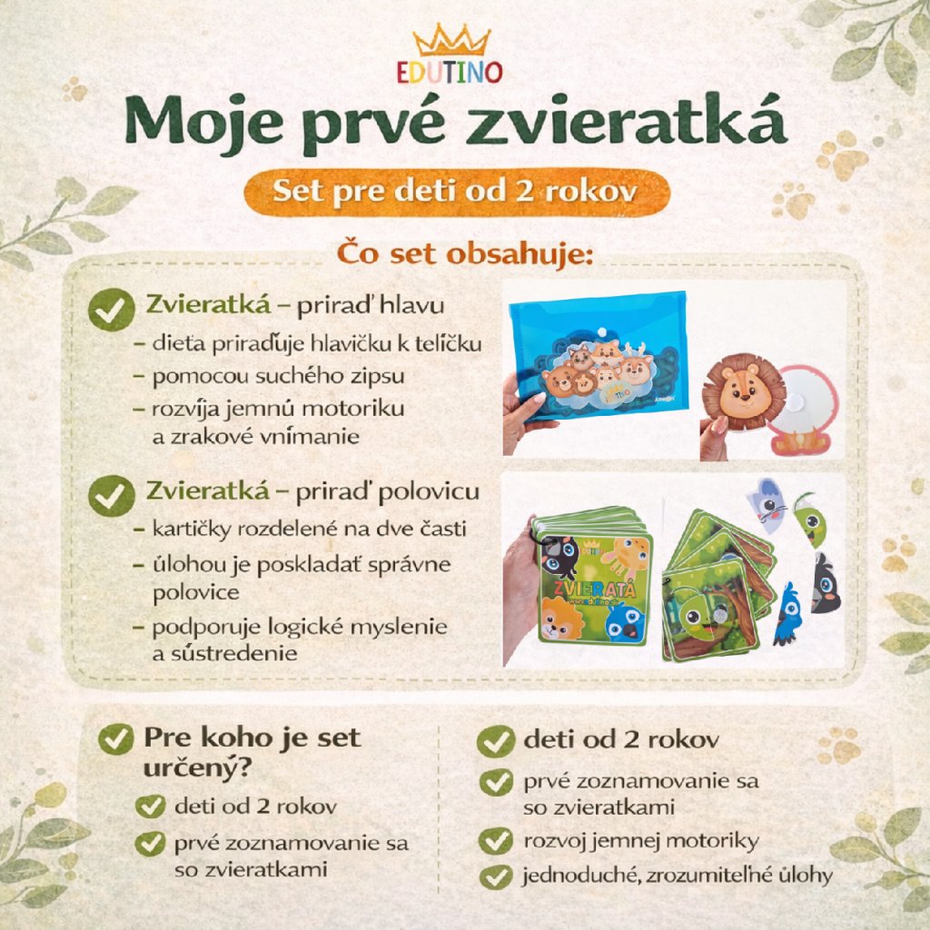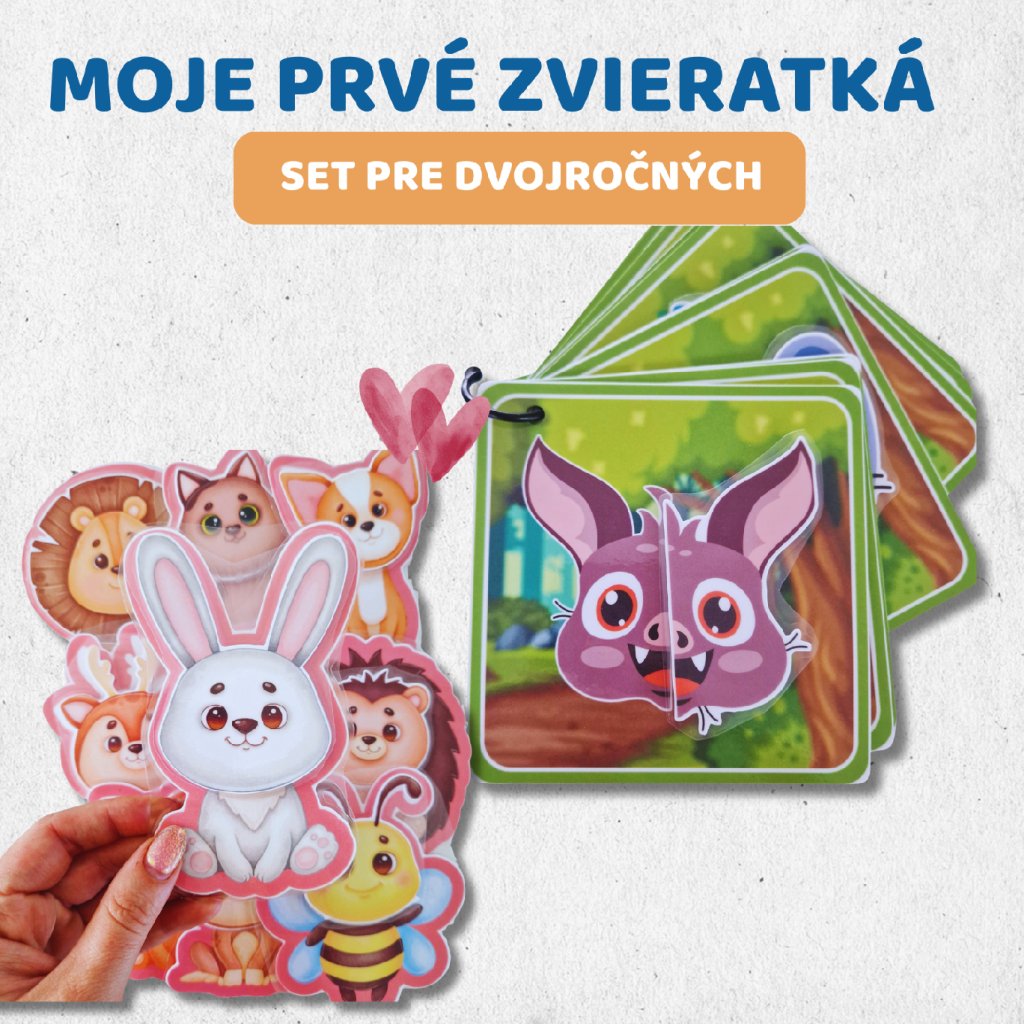 Moje prvé zvieratká je hravý edukačný set pre najmenšie deti od 1,5–2 rokov, ktorý rozvíja jemnú motoriku, zrakové vnímanie a koordináciu ruka–oko.