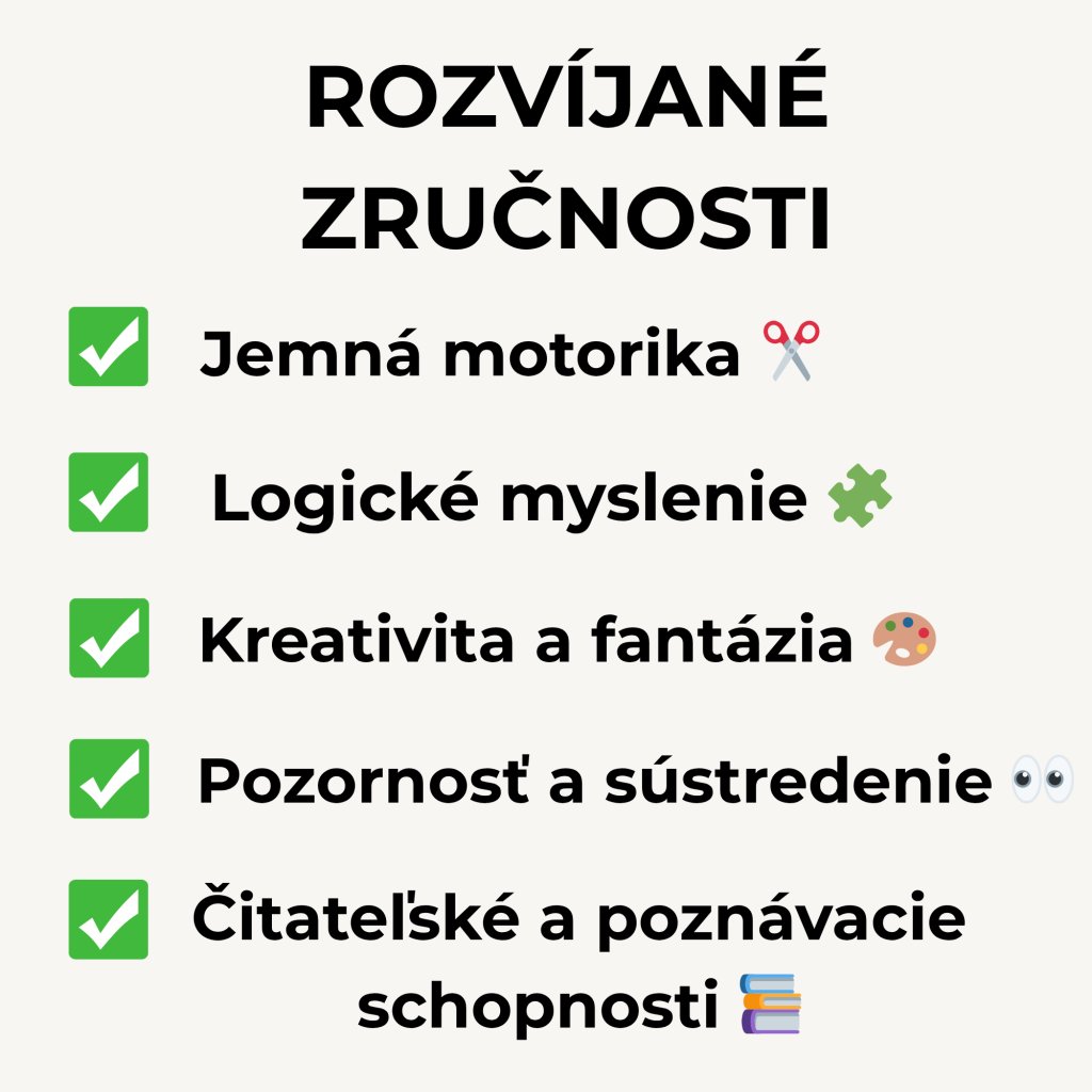 - Úlohy na pozornosť, logiku a kreativitu – Rôzne cvičenia na rozvoj myslenia, ako napríklad abecedné puzzle, zoradovanie podľa veľkosti, tienové pexeso či tréning s ceruzkou.