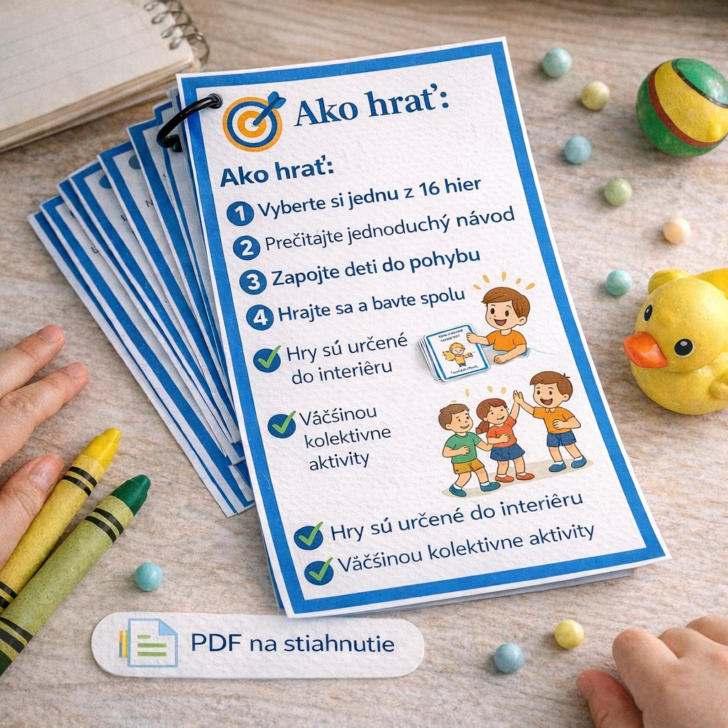 Objavte 16 zábavných a jednoduchých hier pre vnútorné hranie, ktoré sú ideálne aj pre menšie deti a podporujú ich sociálne zručnosti a kreativitu. Tento digitálny PDF súbor je skvelou pomôckou pre učiteľov, animátorov a rodičov, ktorí chcú obohatiť čas strávený s deťmi.