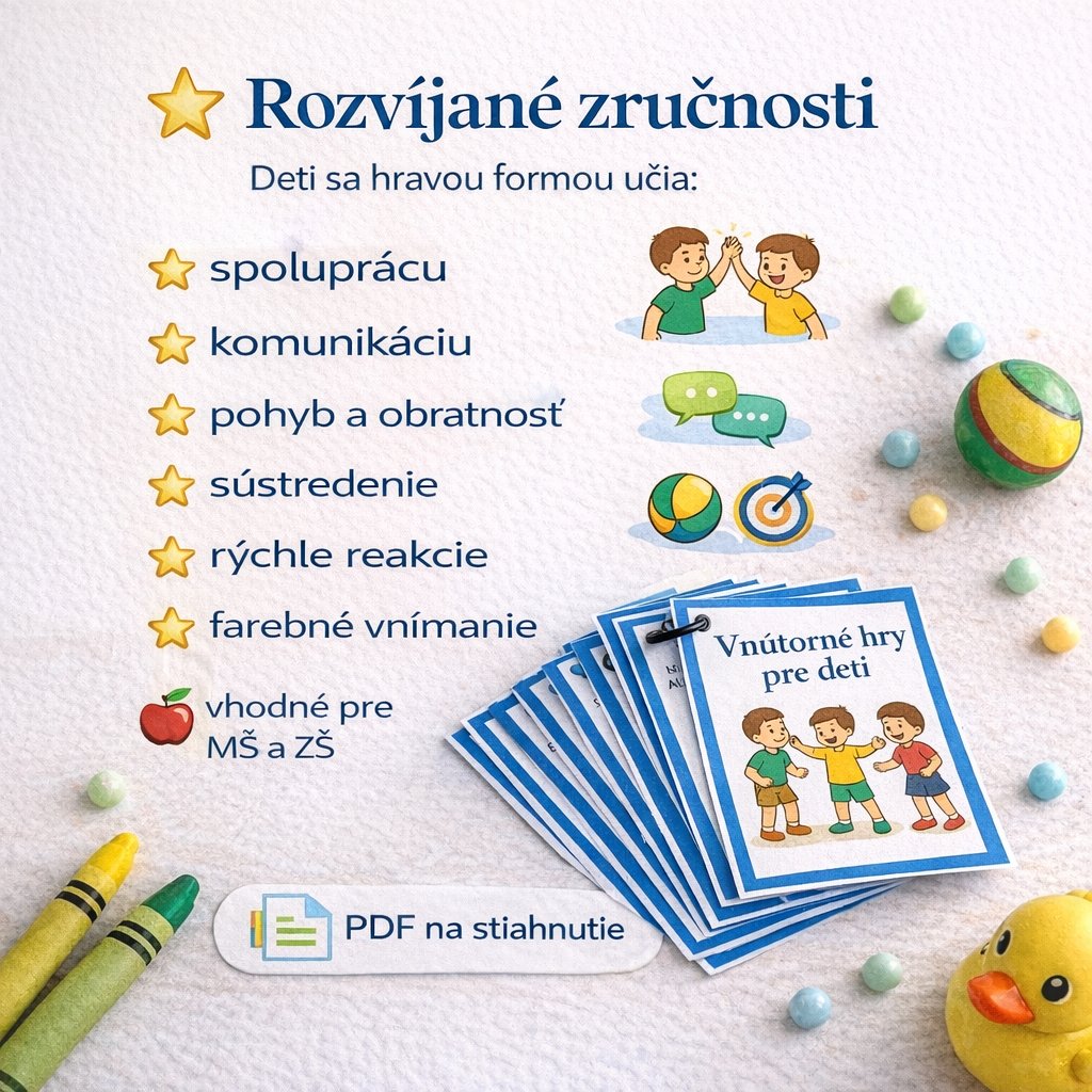 Ponúkame 16 zábavných a jednoduchých hier, ktoré sú ideálne na hranie v interiéri a sú prispôsobené aj pre menšie deti. Tieto hry podporujú rozvoj sociálnych zručností, kreativitu a tímového ducha, pričom ponúkajú množstvo zábavy pre všetkých zúčastnených.