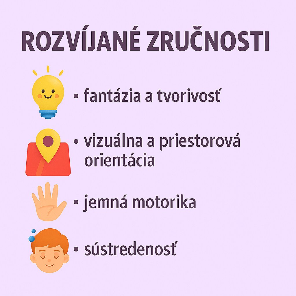 Táto aktivita rozvíja jemnú motoriku, zrakové vnímanie, logické myslenie, priestorovú orientáciu a trpezlivosť.